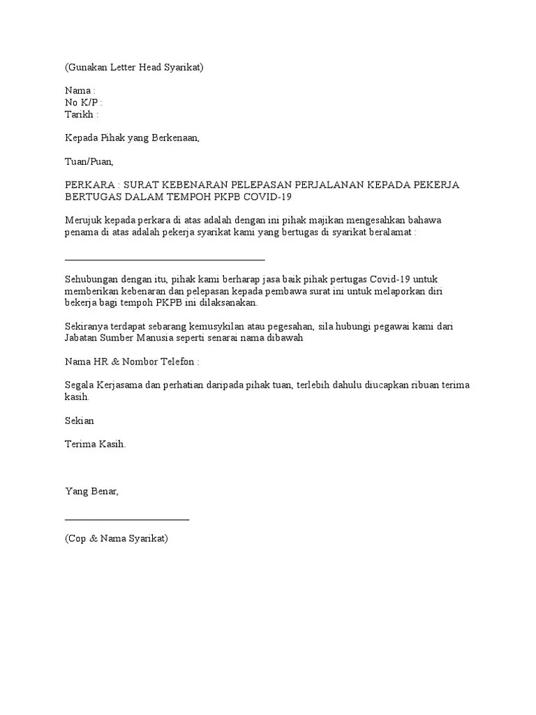 Contoh surat kebenaran bekerja pkp 3.0 pelepasan perjalanan. 533 rebat levi pelepasan kepada penumpang udara bagi perjalanan umrah . Template surat pelepasan hadir bekerja dalam tempoh pkpb .